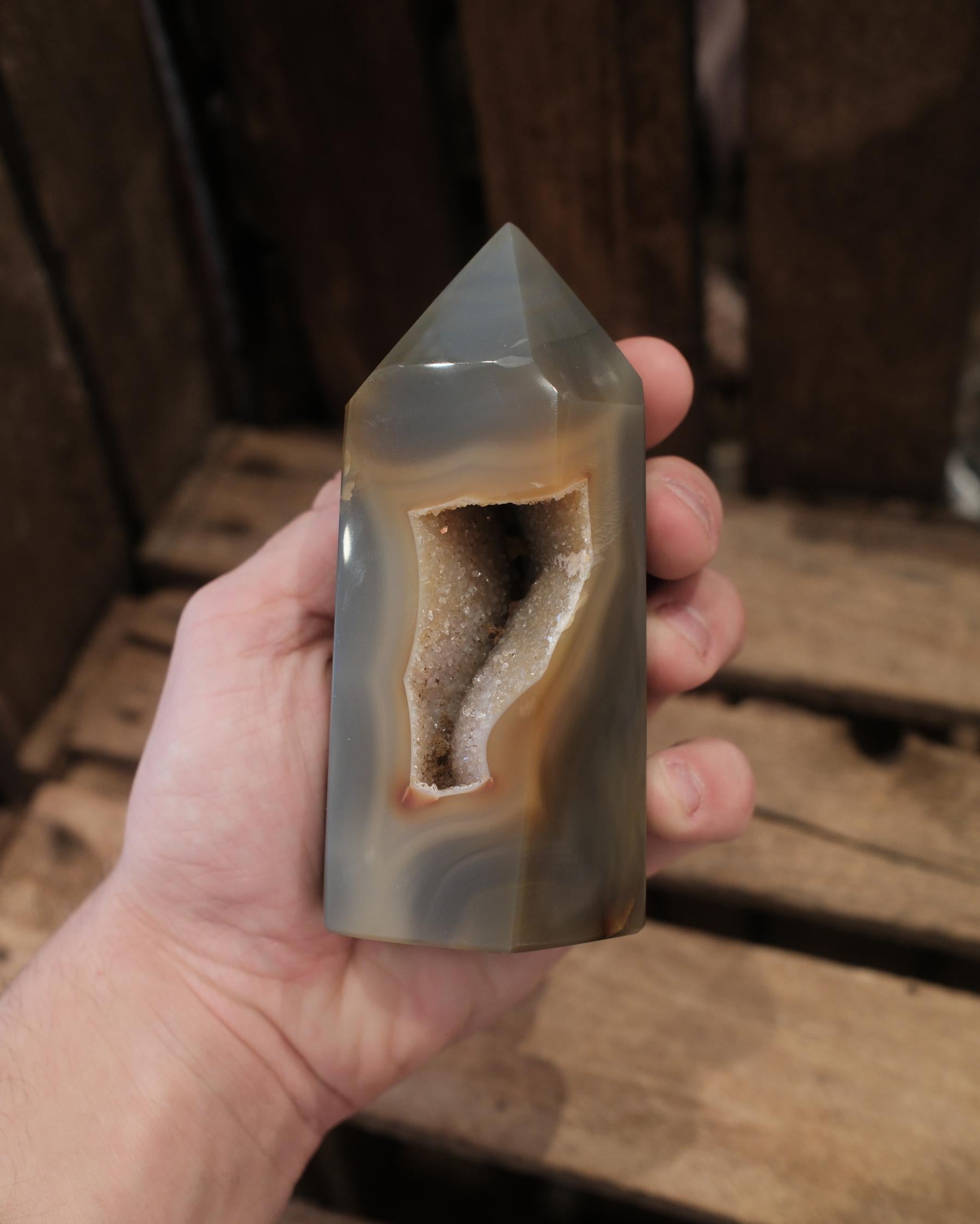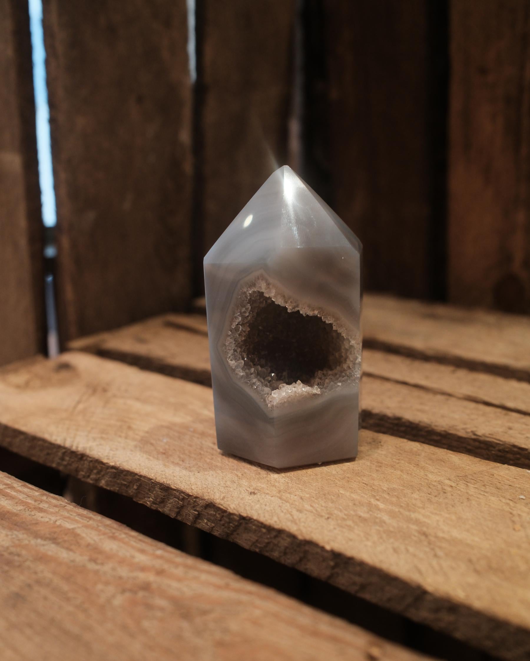 På ena sidan öppnar sig en naturlig kristallgrotta med små, tätt sittande kristaller som glittrar i ljuset. Den ljusa, nästan sandfärgade insidan skapar en fin kontrast mot den släta utsidan och ger tornet ett levande och unikt uttryck.