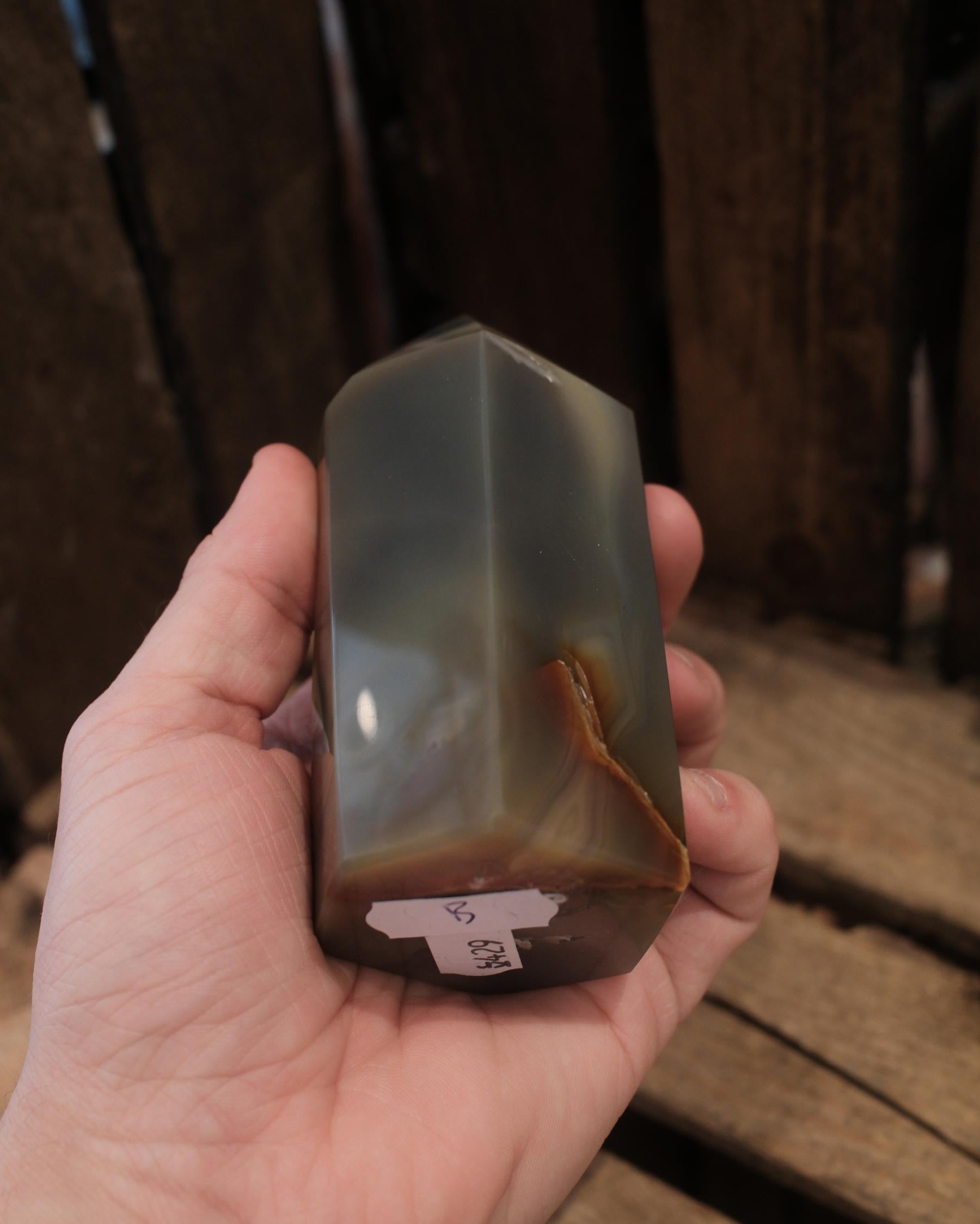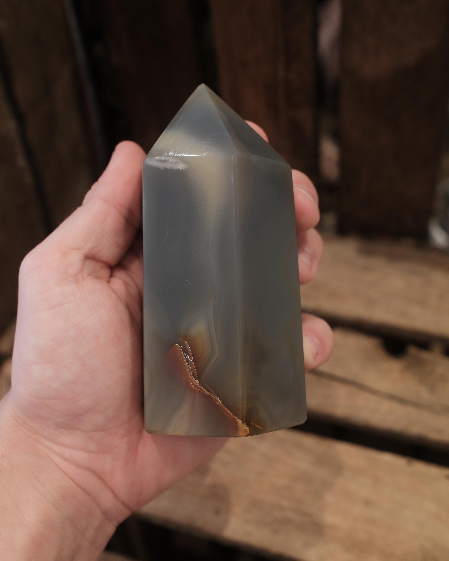 Detta Agat torn har en mjuk, dimmig ton i grågröna nyanser som ger stenen ett nästan lugnande och stilla uttryck. Den halvtransparenta ytan fångar ljuset på ett subtilt sätt och låter de naturliga lagren skymta igenom, vilket skapar ett djup som förändras beroende på vinkel.