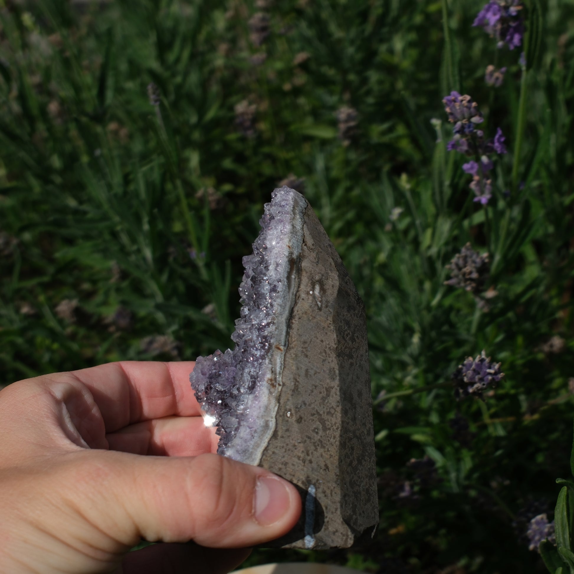 Andliga egenskaper: Ametist är känd för att skapa lugn, harmoni och ro i sinnet. Den sägs skydda mot negativa energier och främja en känsla av trygghet. Kristallen används ofta för att lindra sömnproblem och motverka mardrömmar genom att skapa en fridfull atmosfär i sovrummet. Den förstärker också meditation genom att stilla tankarna och öppna upp för högre medvetande. Många upplever att ametist ger klarhet i beslut, stärker självinsikt och hjälper till att släppa destruktiva beteendemönster.