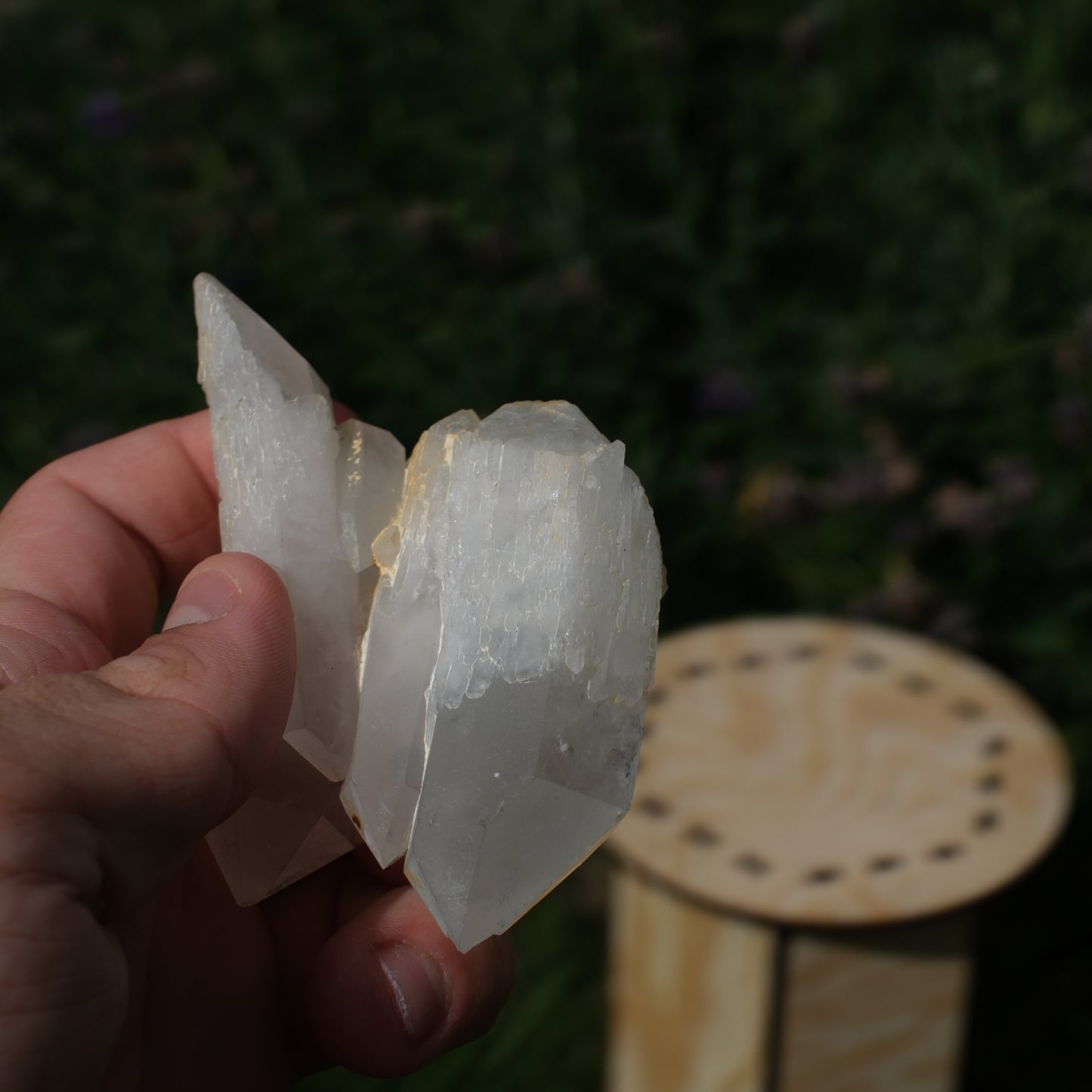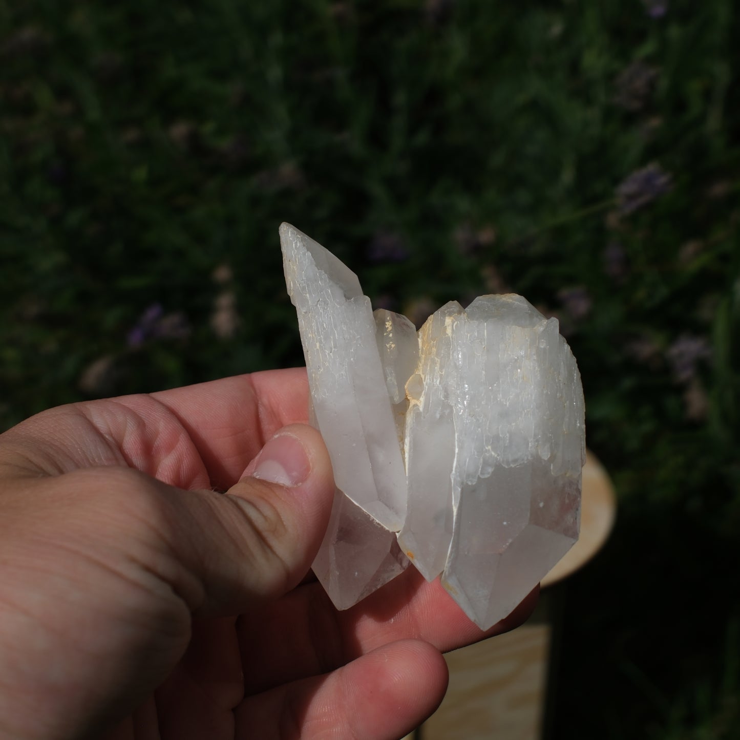 Ett vackert stycke bergkristall med flera sammanväxta spetsar som fångar ljuset på ett fantastiskt sätt. Kristallen visar naturliga former med både klara och mjölkiga partier som ger den ett unikt uttryck. En dekorativ samlarsten som passar lika bra i ett vitrinskåp som på ett altare eller som energisten i ditt hem.