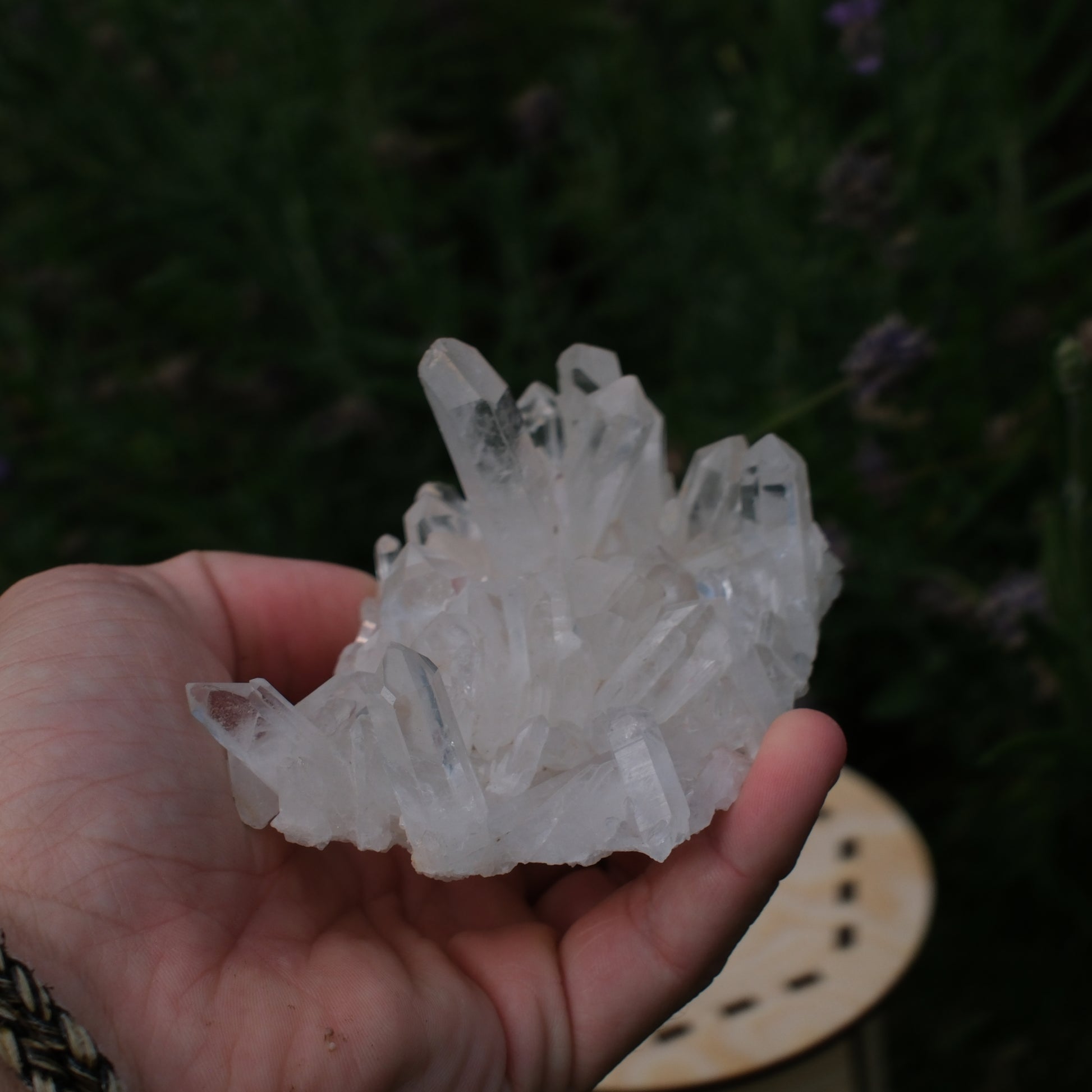 Ett vackert bergkristallkluster med flera klara och ståtliga kristallspetsar som växer naturligt från basen. Kristallerna har en ljus och ren energi, perfekt som dekoration, i samlingar eller för energiarbete. Bergkristall är känd som en kraftfull och renande sten som förstärker energi och skapar balans. Detta kluster är ett unikt exemplar med fin glans och naturlig form.