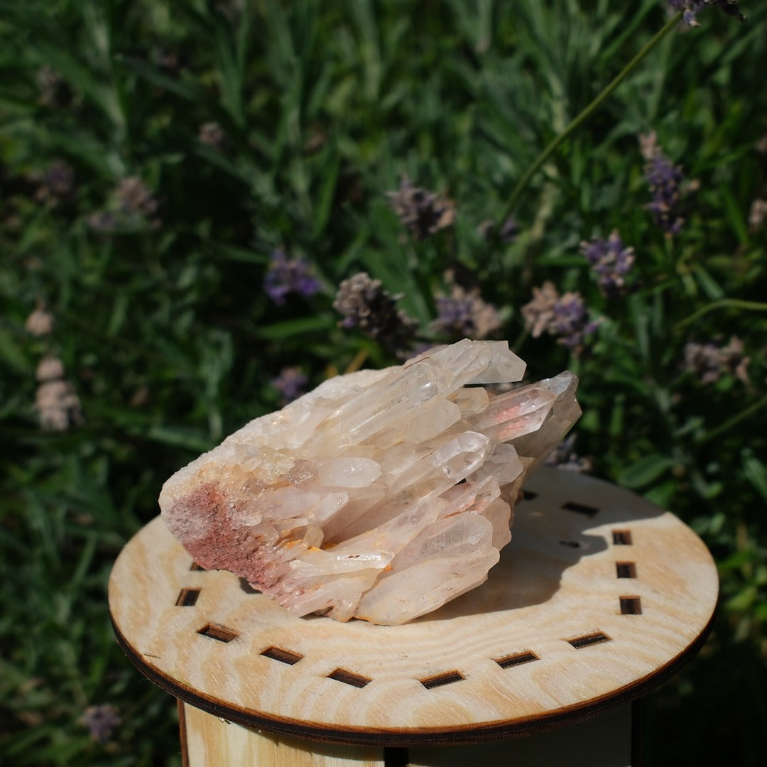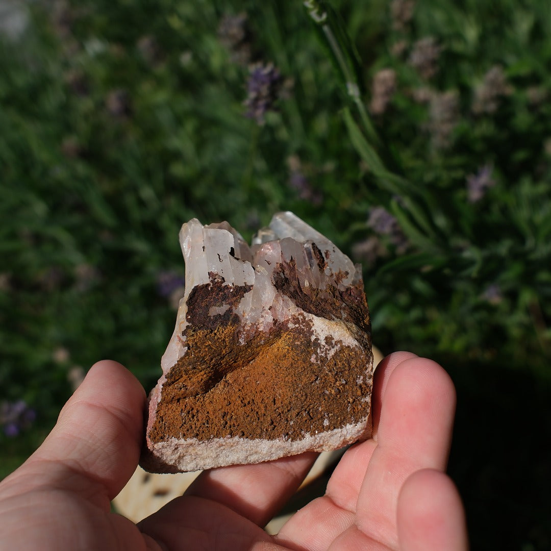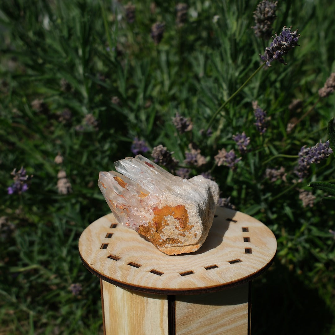 Ett bergkristallkluster med flera spetsar som vuxit fram ur en bas med varma jordtoner. Kristallen fångar ljuset fint i sina spetsar samtidigt som den bär spår av den plats den formats på. Rå, äkta och naturlig. En sten som känns både jordad och ljus på samma gång.