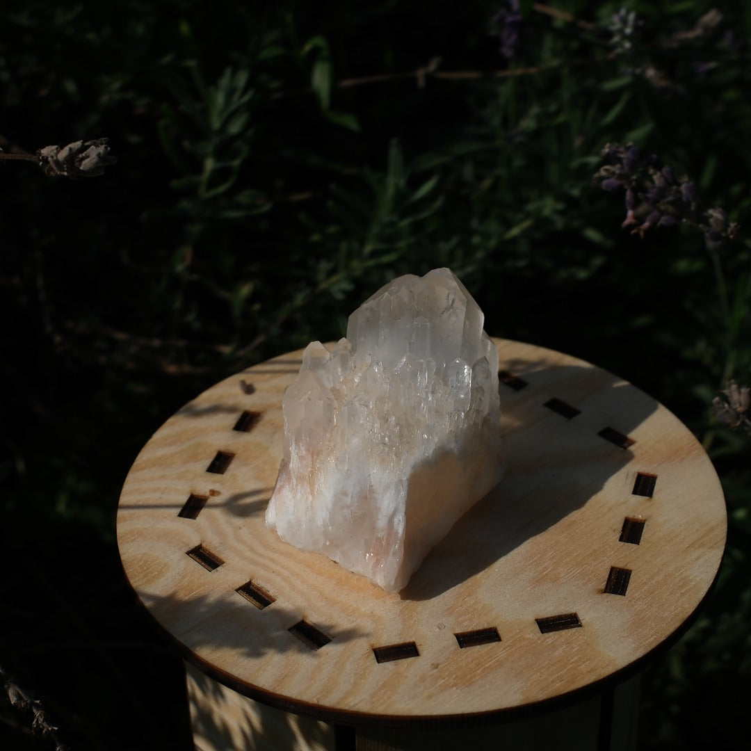 Vackert bergkristallkluster med flera klara spetsar i naturlig formation. Kristallen har en mjuk vit ton med subtila inslag av jordiga nyanser som framhäver dess naturliga ursprung.