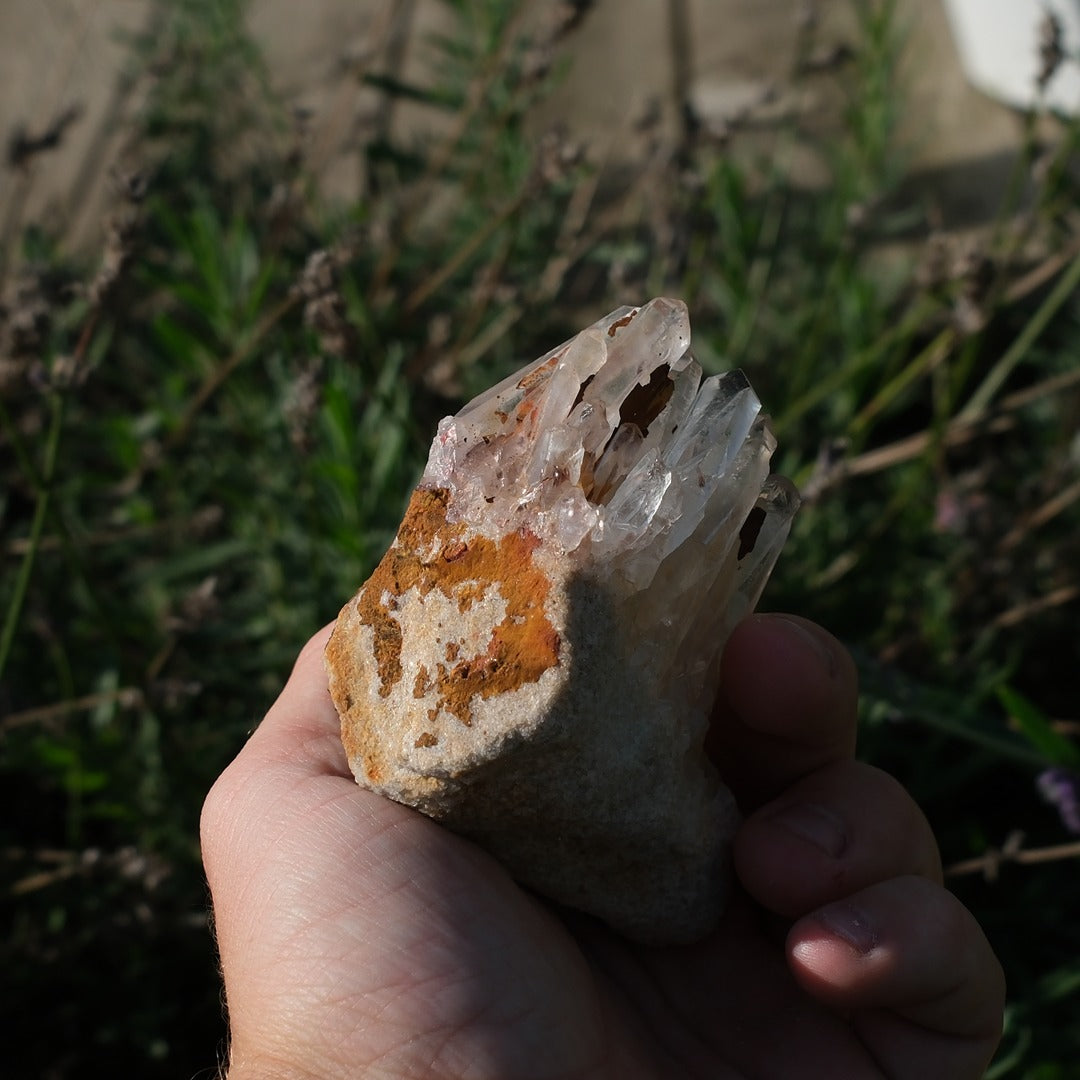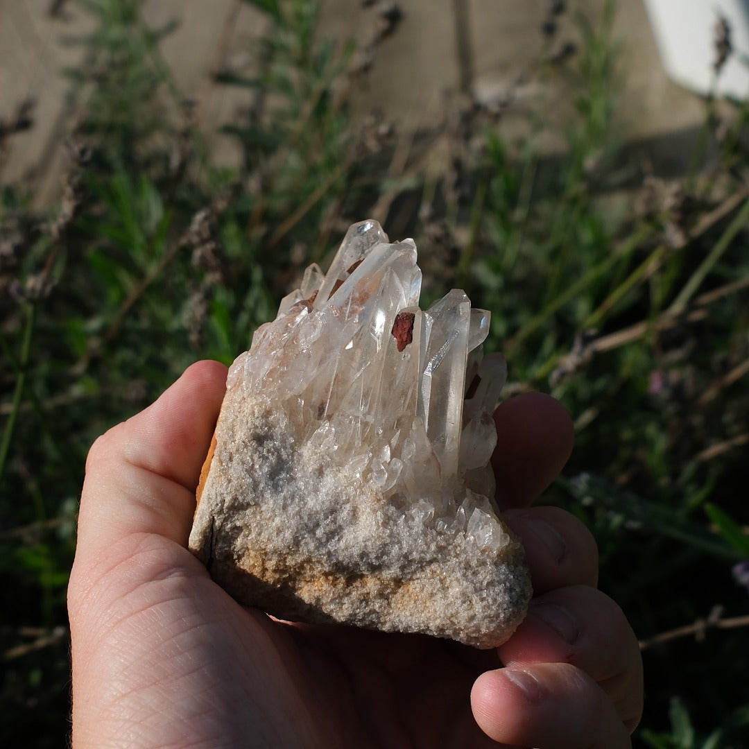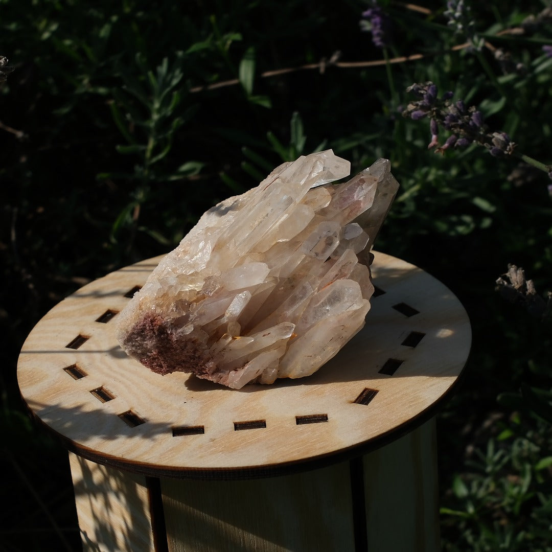 Detta kraftfulla bergkristallkluster bjuder på långa, klara kristaller som växer tätt tillsammans på sin naturliga bas. Klustret har inslag av jordiga toner och mineralrester som förstärker dess autentiska och råa känsla.