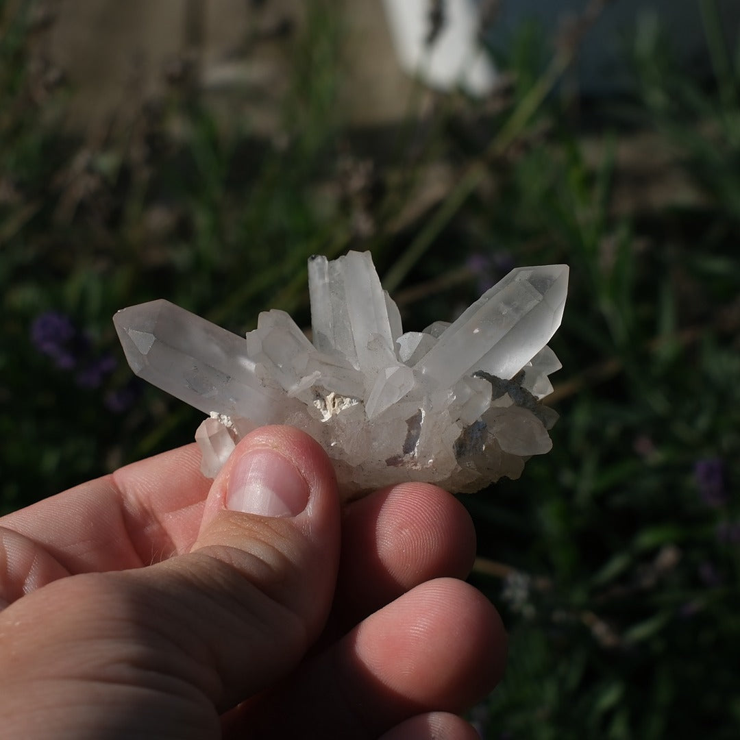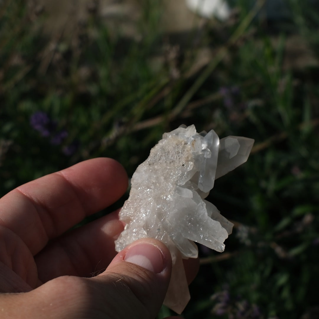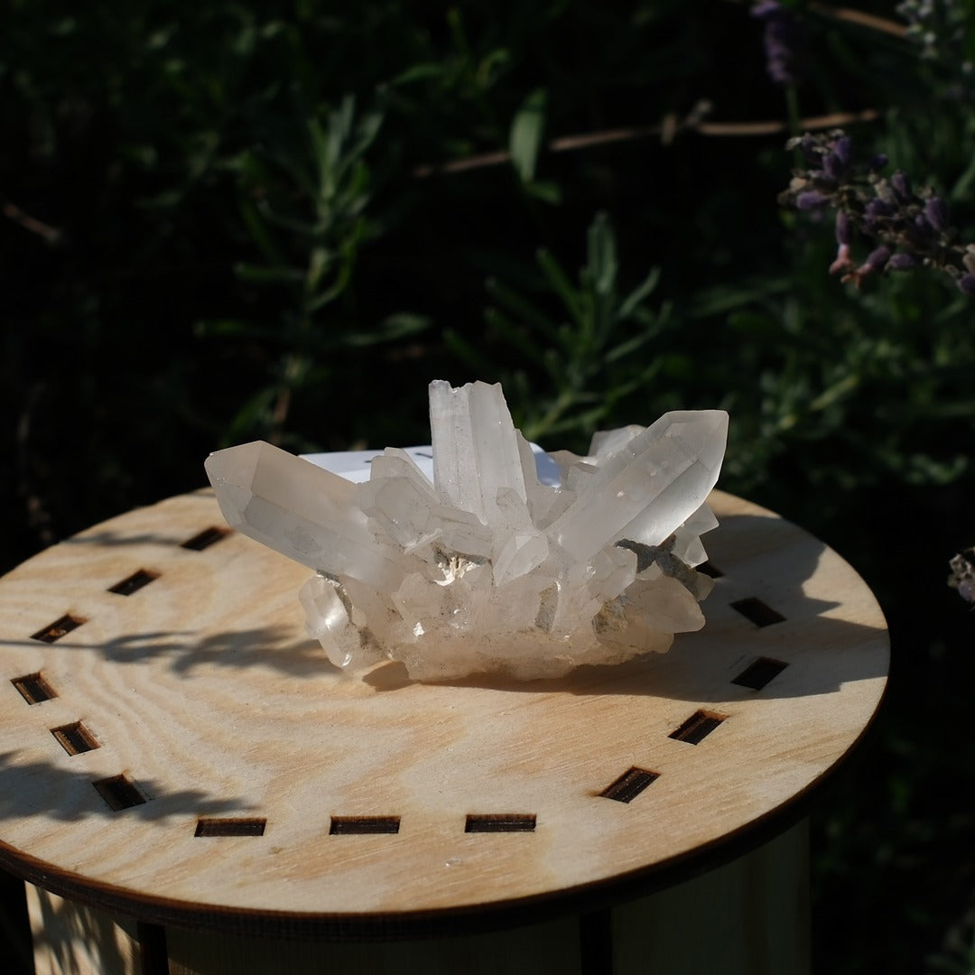 Detta vackra bergkristallkluster utmärks av sina många klara och välformade spetsar som strålar i naturligt ljus. Kristallen symboliserar klarhet, energi och balans, och den är perfekt för meditation, healing eller som en dekorativ inredningsdetalj.