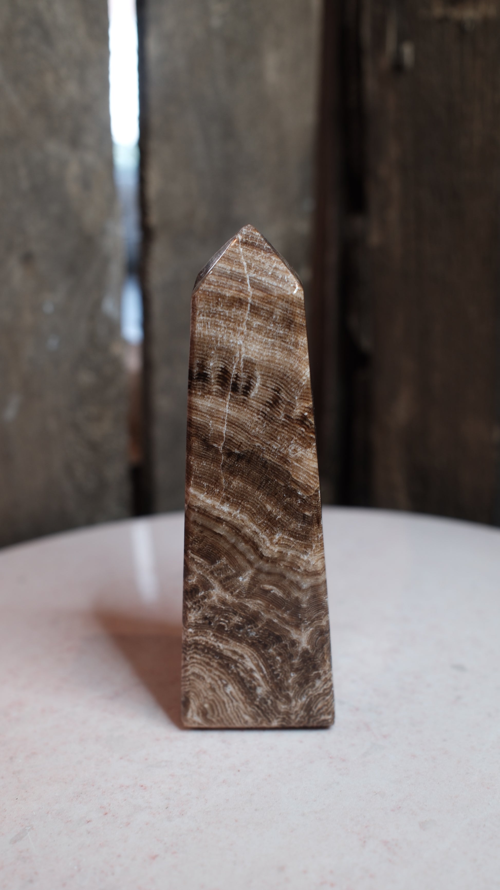 Dessa torn i chokladkalcit bär på varma, jordnära nyanser av brunt, beige och karamell. De naturliga mönstren skapar mjuka, böljande lager som påminner om årsringar eller landskap i rörelse, varje torn med sitt helt egna uttryck.