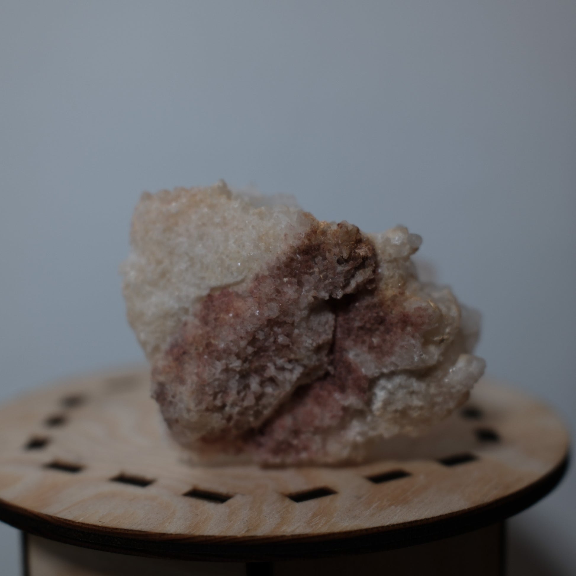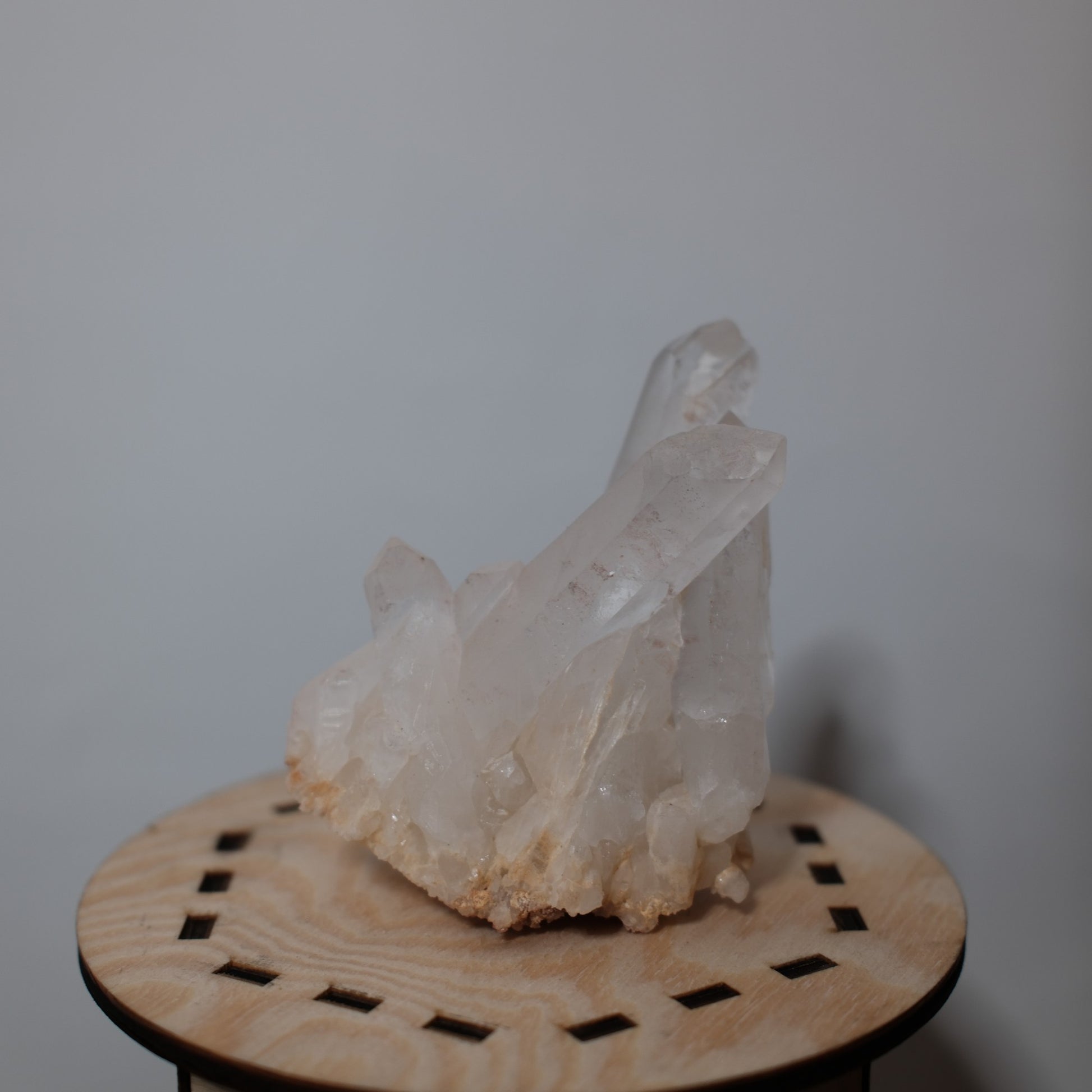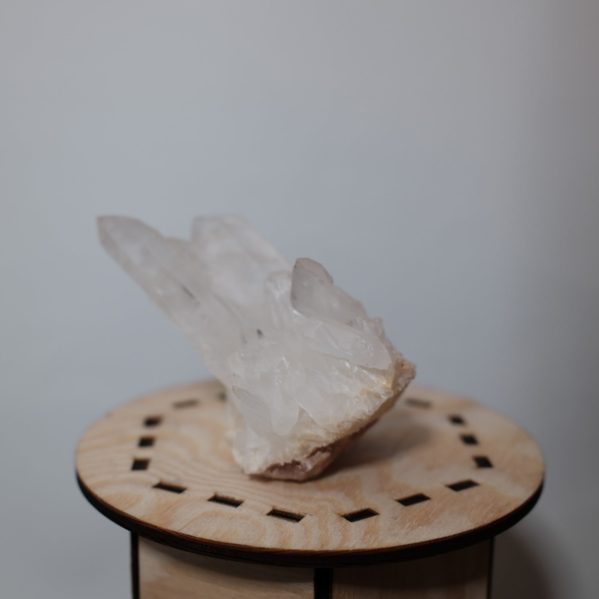 En naturlig bergkristall där klara spetsar möter mjuka, jordnära nyanser i basen. Kristallerna reser sig i olika höjder och fångar ljuset på ett sätt som gör att hela stycket känns levande. På baksidan syns varma, rosa-bruna mineralinslag som ger klustret en extra karaktär.
