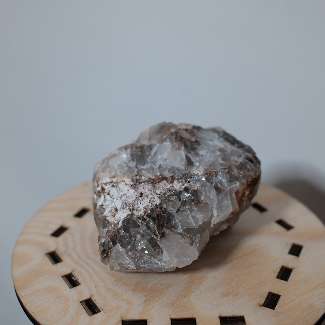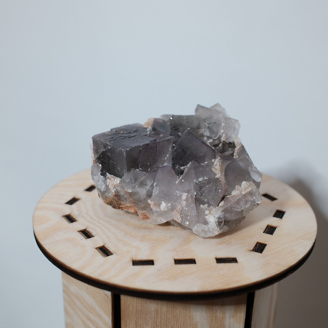 En kompakt och kraftfull bit fluorit där de kubiska kristallerna ligger som i lager på lager. Färgen skiftar från djupa lila toner till mjukare grå och transparenta partier, med små inslag av vita och bruna mineraler som ger stenen en naturlig känsla. Den känns stadig, balanserad och lite mystisk – perfekt på skrivbordet, altaret eller som en detalj i ett rum där du vill bjuda in klarhet och fokus.