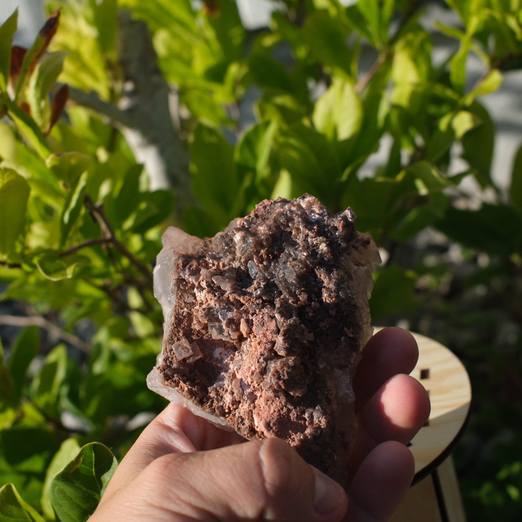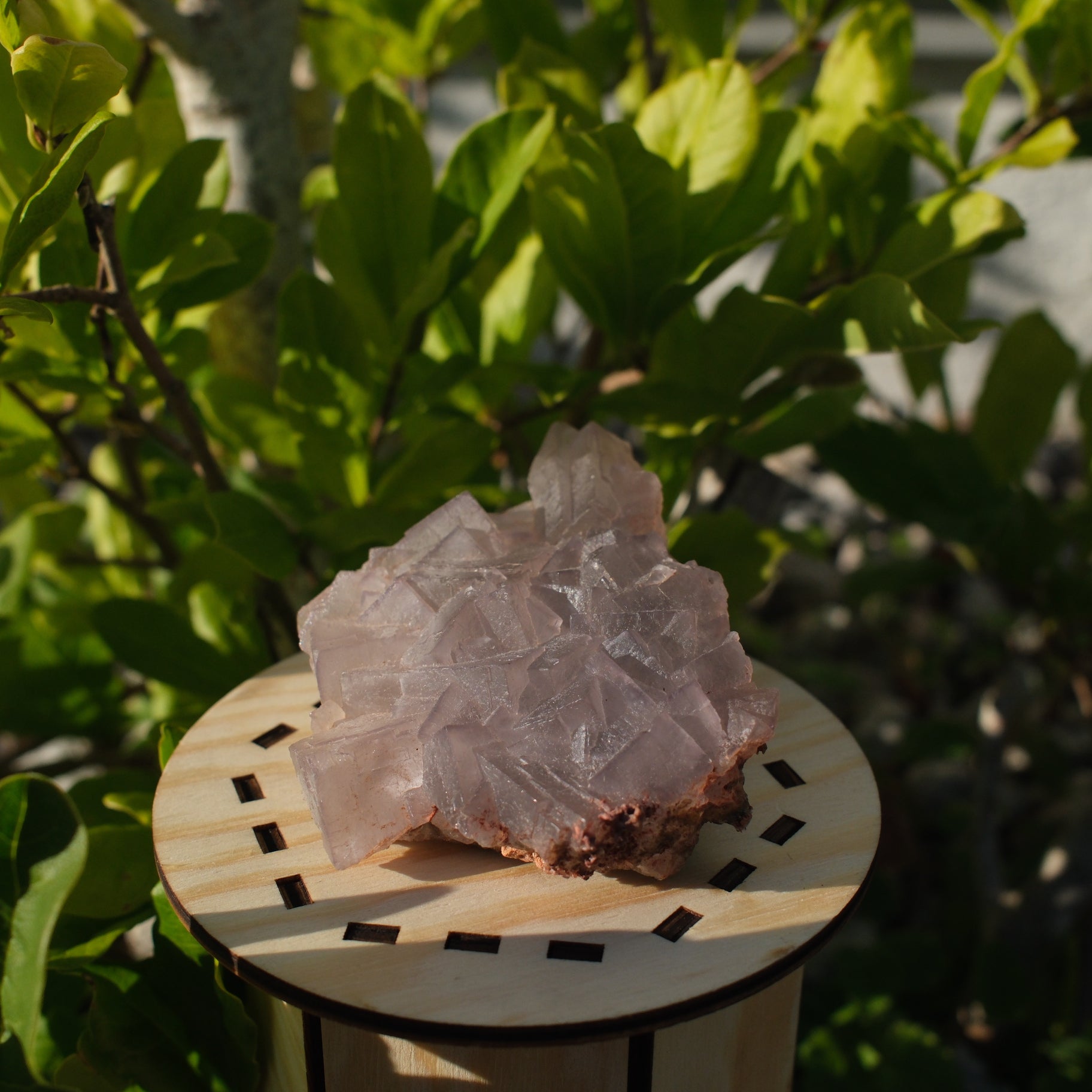 En ovanlig bit lila fluorit med tydliga, nästan kubformade kristaller på ytan. Färgen är mjuk och skiftar mellan ljuslila och grått beroende på ljuset. Baksidan bär spår av jorden den vuxit i – rå, rödbrun och orörd. Det är en sten som både sticker ut och smälter in, perfekt för dig som gillar det lite annorlunda.