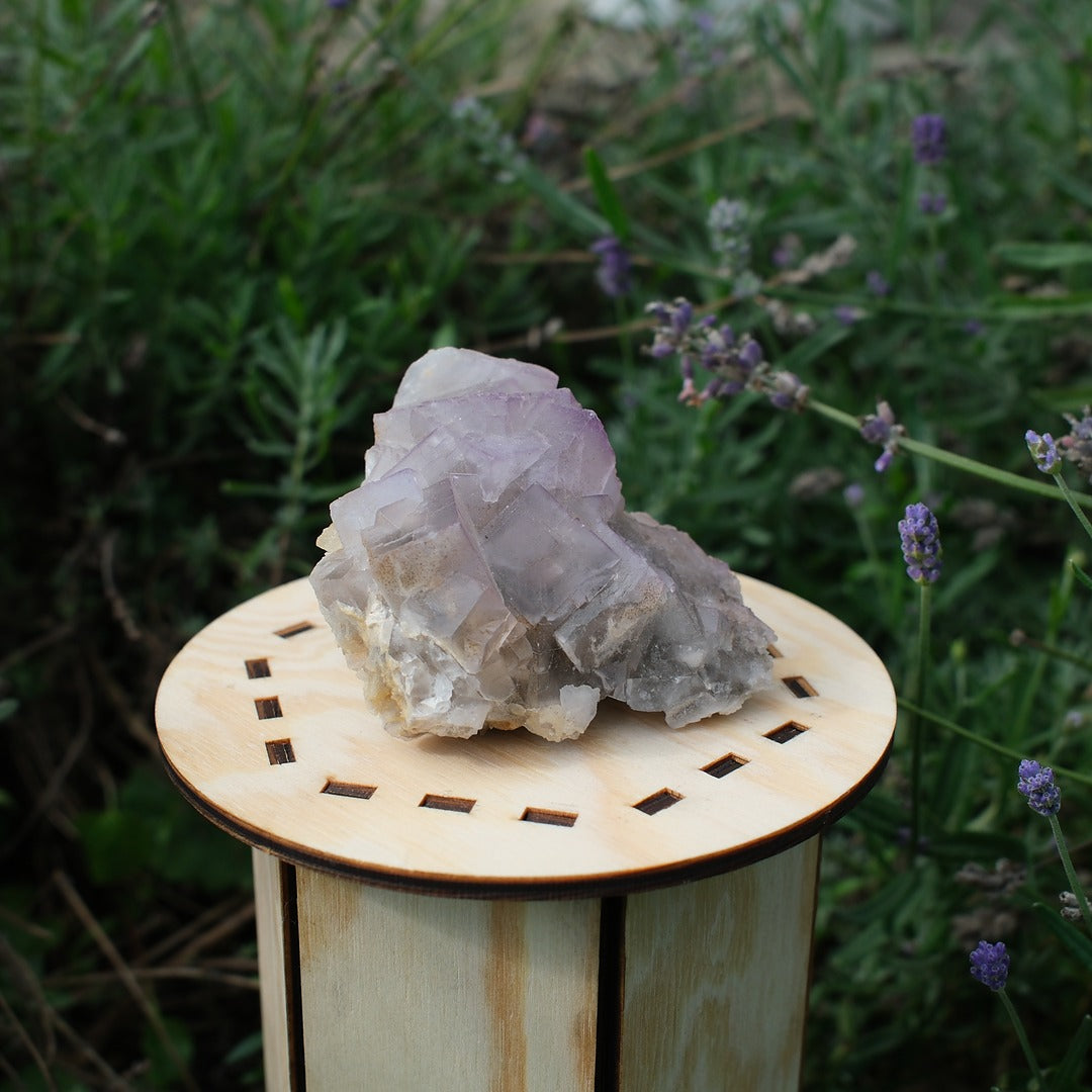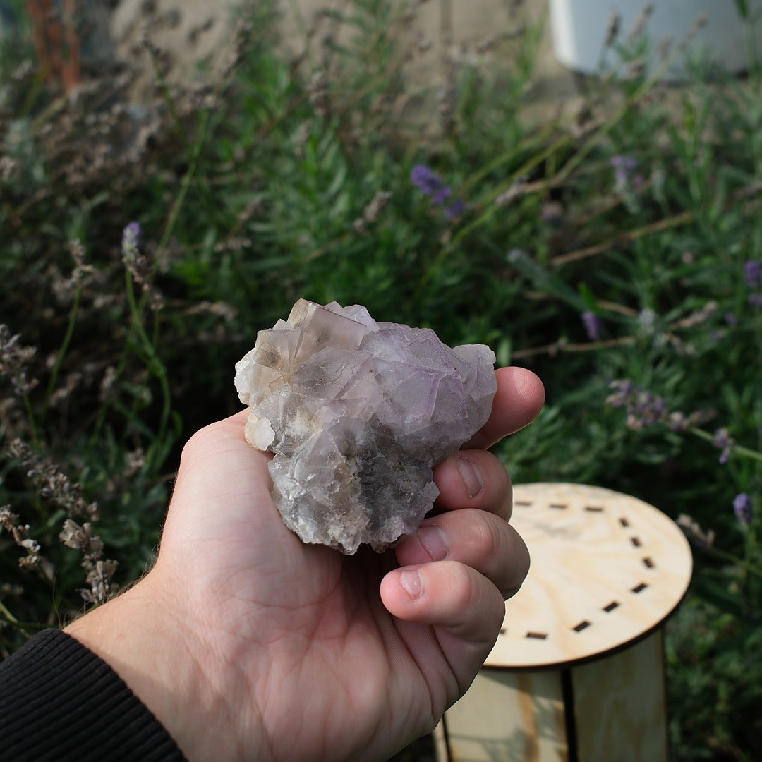 Ett vackert stycke lila fluorit med tydliga kubiska formationer och en mjuk ton i färgen. Fluorit är känd för sina rena geometriska former och sitt lugna uttryck, perfekt för dig som uppskattar naturens egna konstverk.