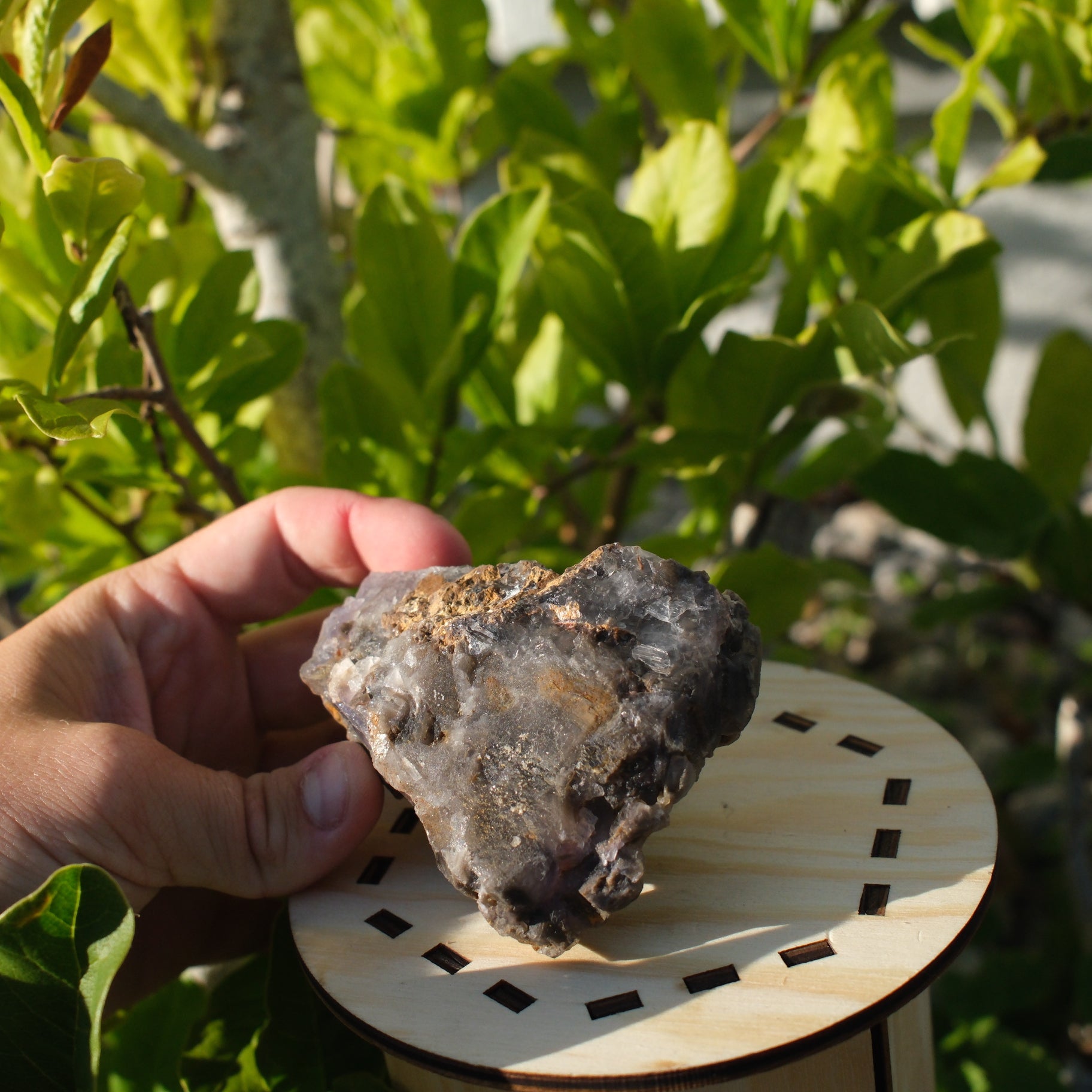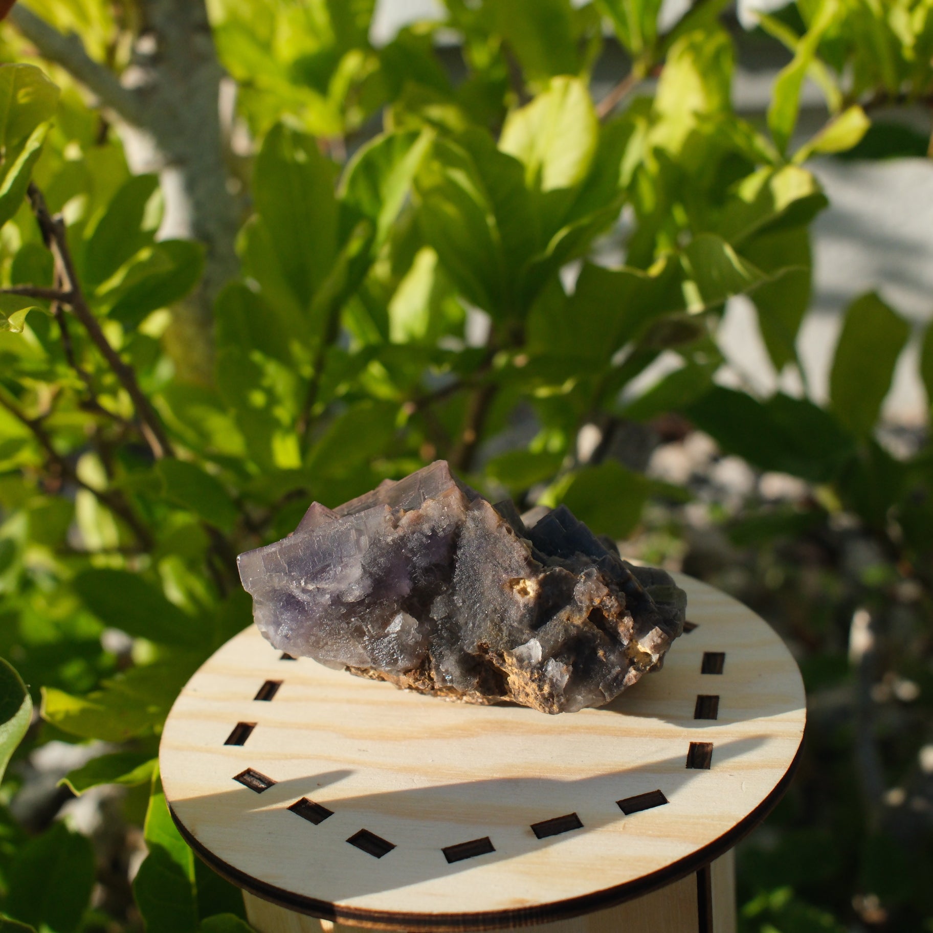 En djup, nästan rökig bit lila fluorit med rå struktur och kubiska formationer som bryter upp ytan. Den bär tydligt spår av jorden den vuxit i – med mörka partier och gyllene mineraler insprängda. Det är en sten som känns tung, stadig och lite hemlig.