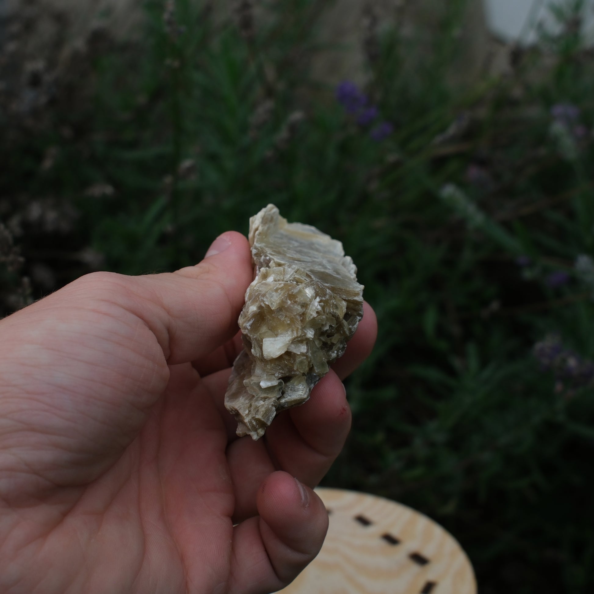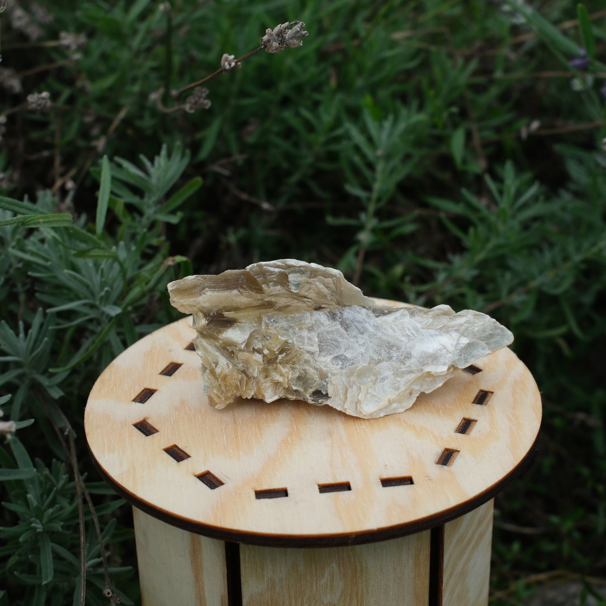 Ett vackert stycke muskovit med sina skimrande skikt och gyllene toner. Ljuset reflekteras fint i ytan och framhäver stenens naturliga struktur.
