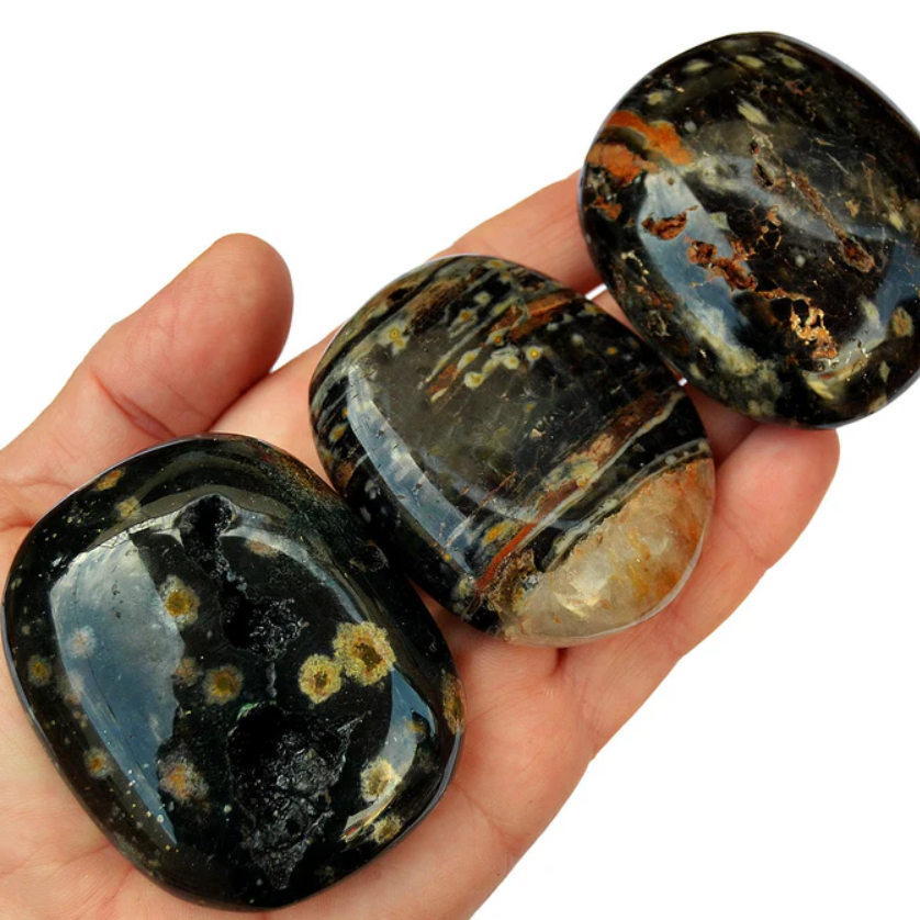 Denna större, trumlade handsten ligger stadigt och behagligt i handen och ger en tydlig känsla av närvaro och trygghet. Ocean jaspis är särskilt uppskattad för sin förmåga att minska stress, skapa inre harmoni och hjälpa dig att följa livets naturliga flöde.