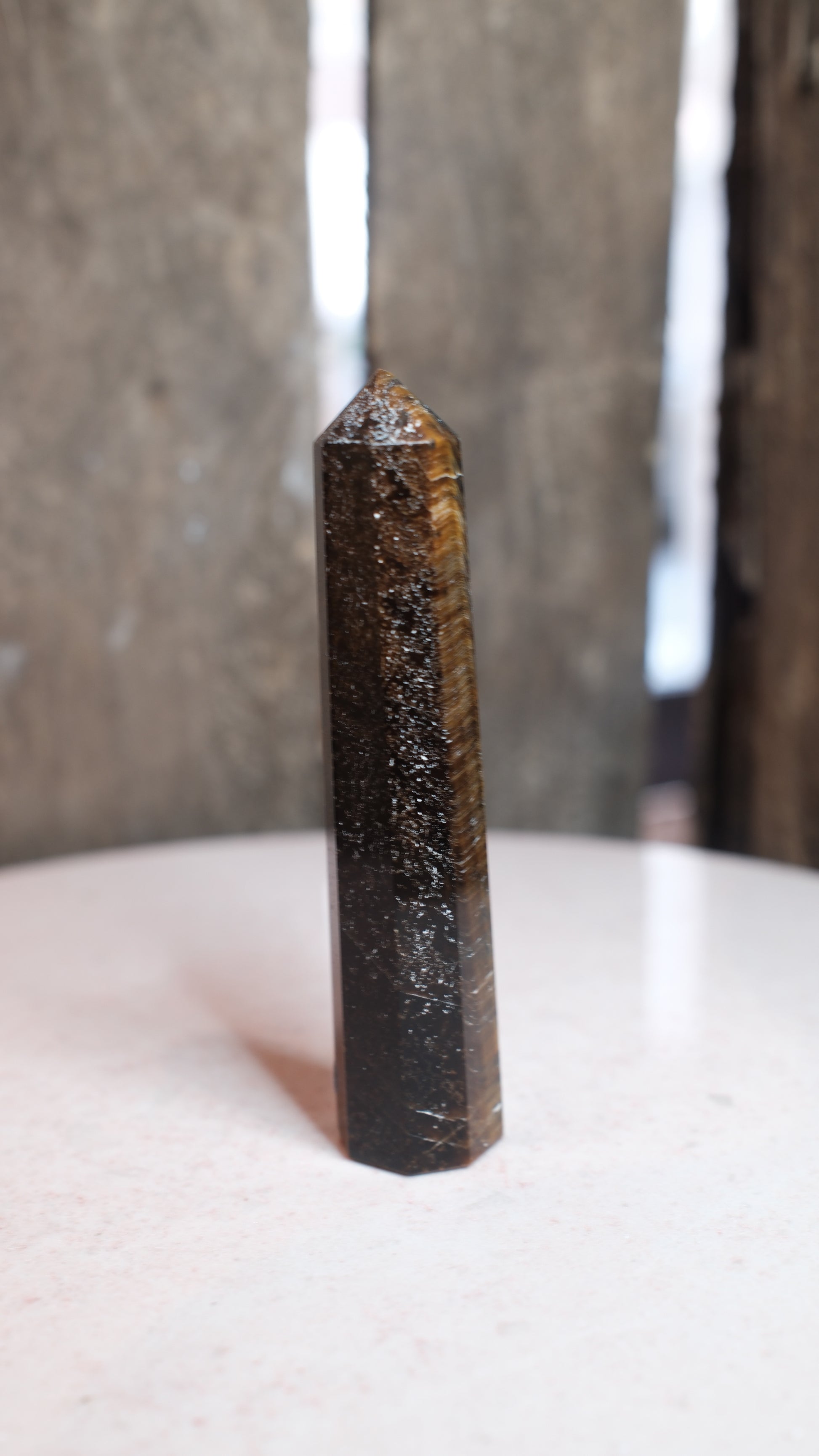 Tigeröga kännetecknas av sina djupa bruna toner som bryts av med gyllene skimmer. När ljuset träffar stenen uppstår en mjuk, levande lyster som rör sig över ytan och ger tornet ett nästan flytande uttryck.